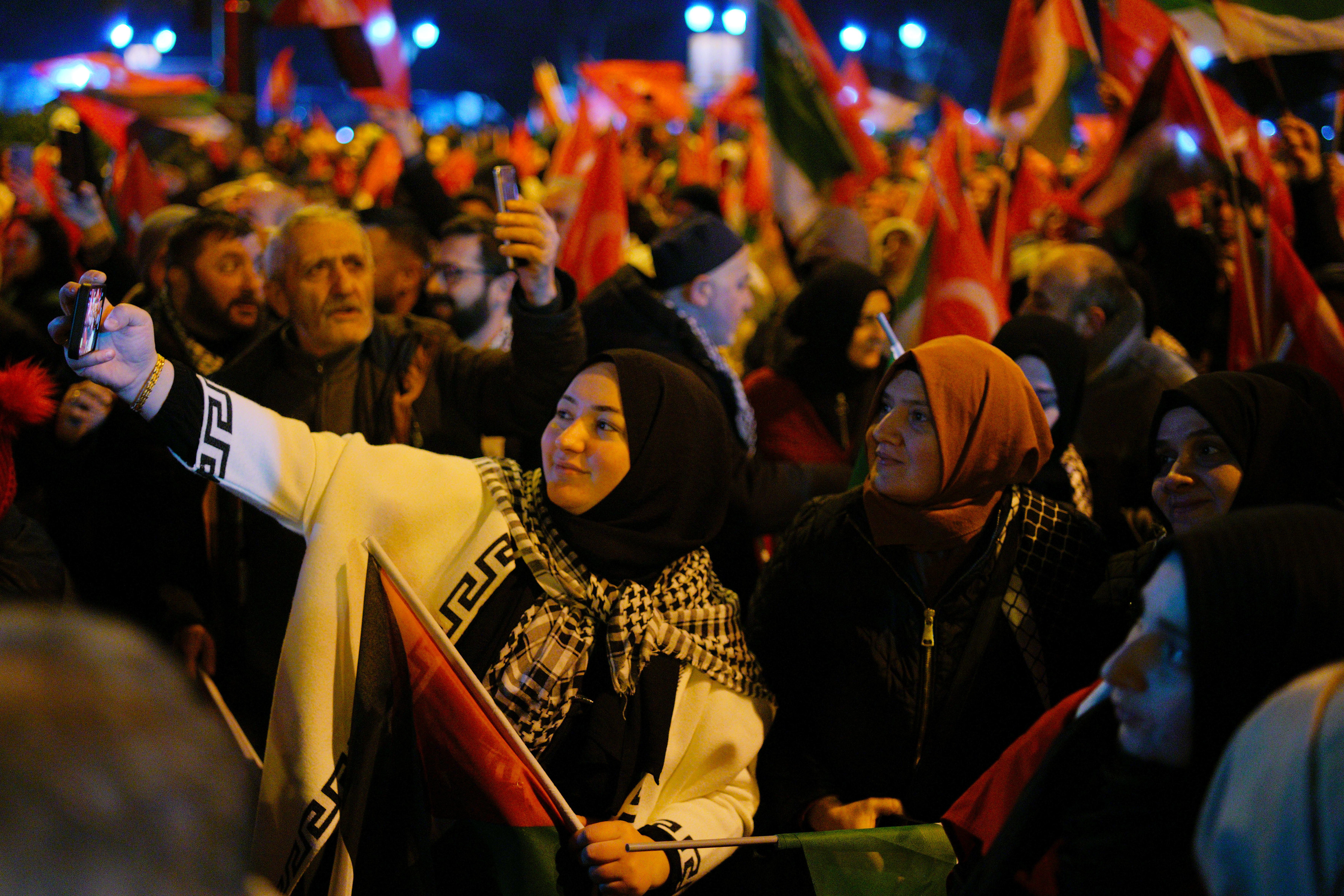 Pro-Palestine people wave Palestinian and Turkish flags during march in solidarity with Palestinians in Gaza over the Galata Bridge in Istanbul on January 1, 2025.