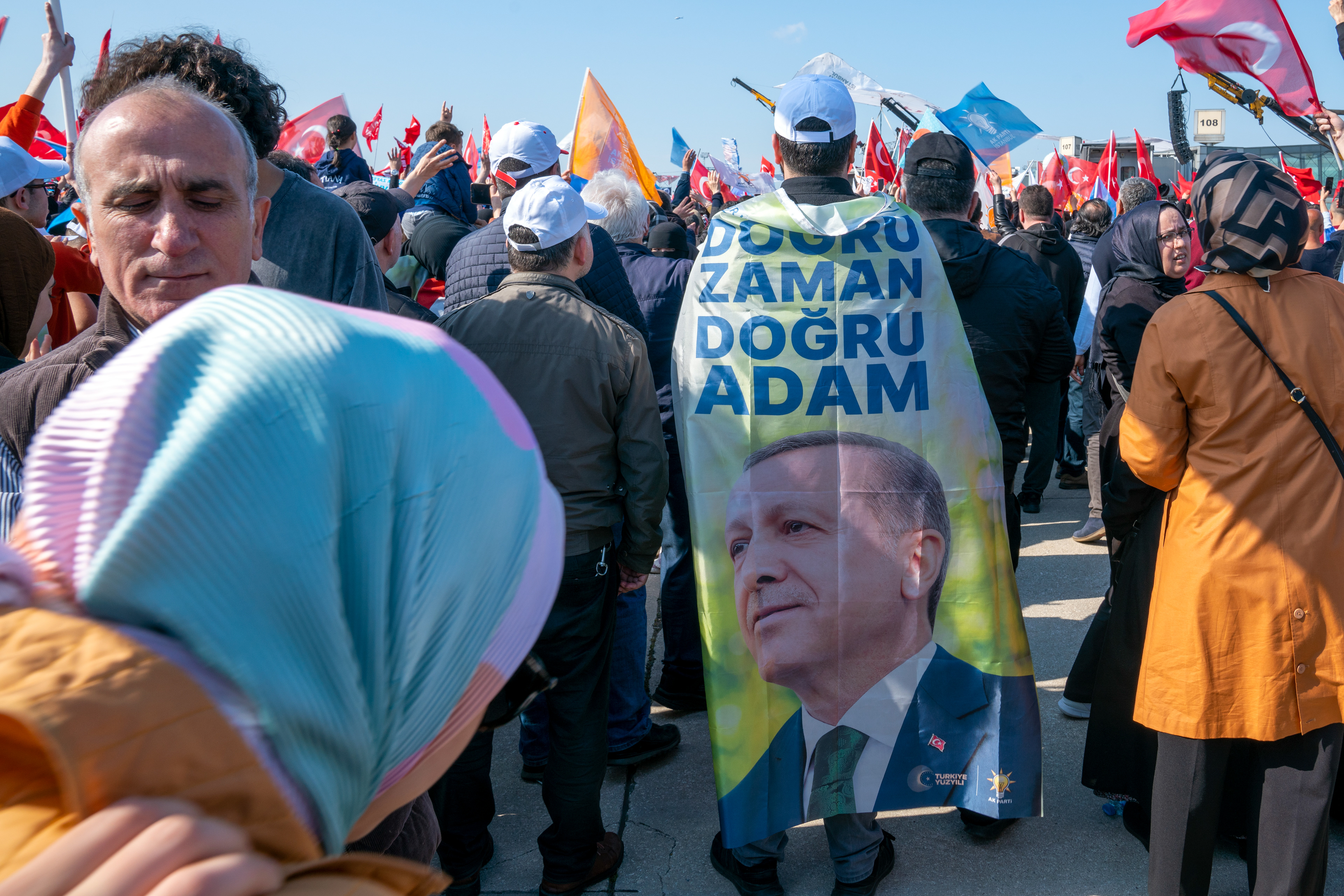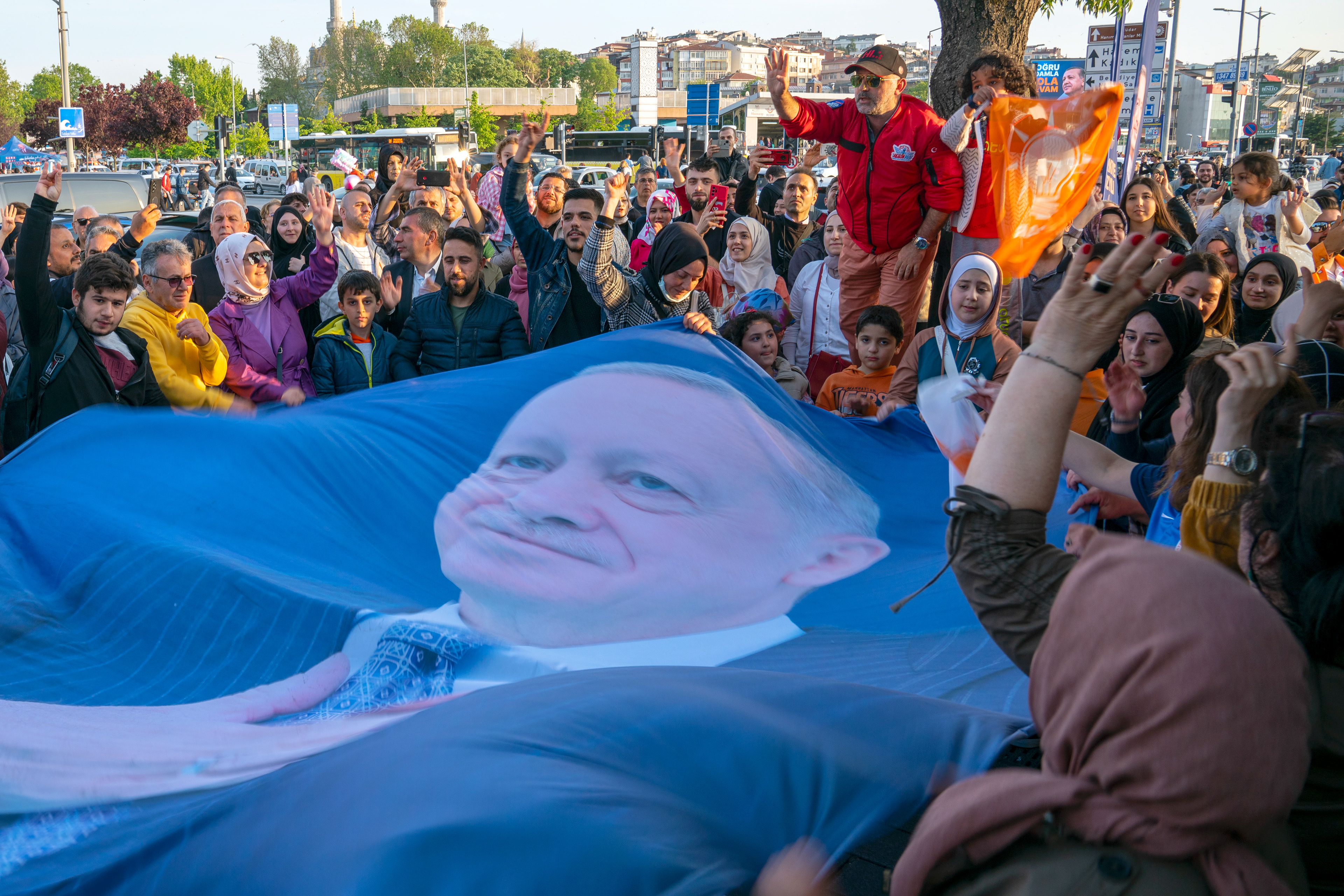 May 21, 2023, Istanbul, Turkey: Supporters of Turkish President Erdogan, wave a large banner with the image of Erdogan, campaigning ahead of the second round of Turkey's Presidential Elections, which will be held on May 28 between Erdogan and Nation Alliance candidate Kilicdaroglu.